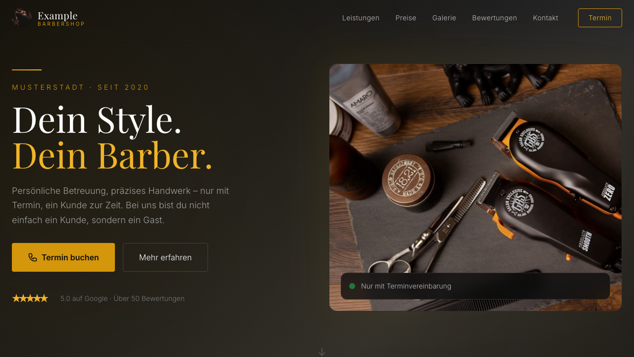 Template für Barbershops mit Dienstleistungen, Preisen und Terminbuchung.