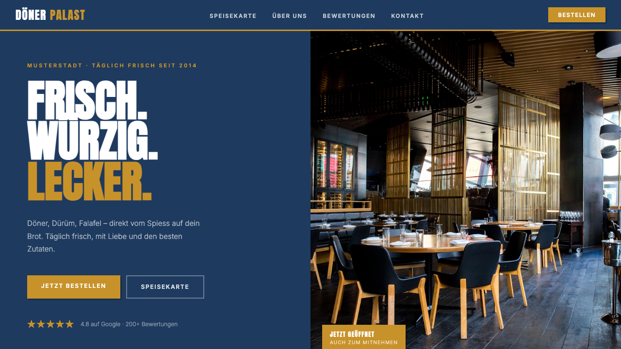 Template für Gastronomiebetriebe mit Speisekarte, Öffnungszeiten und Standort-Übersicht.