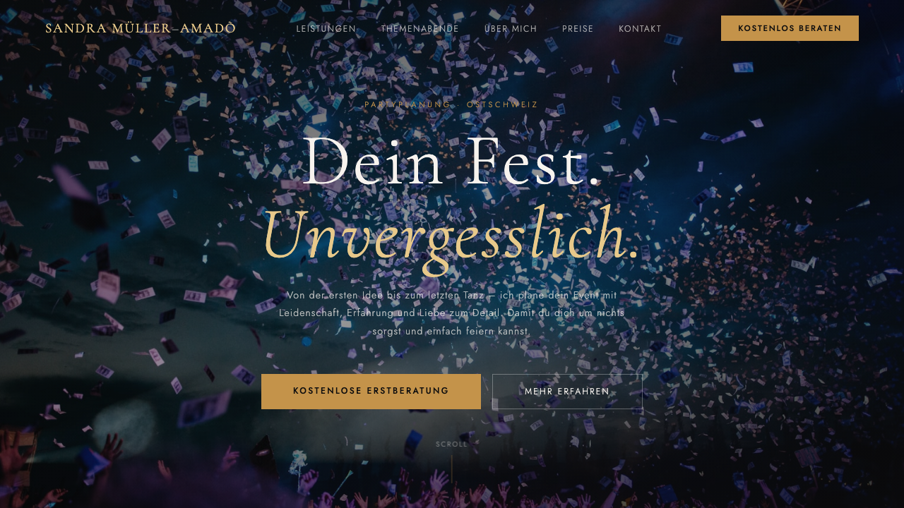 Template für Event- und Partyplanungs-Services mit Leistungen, Galerie und Kontakt.